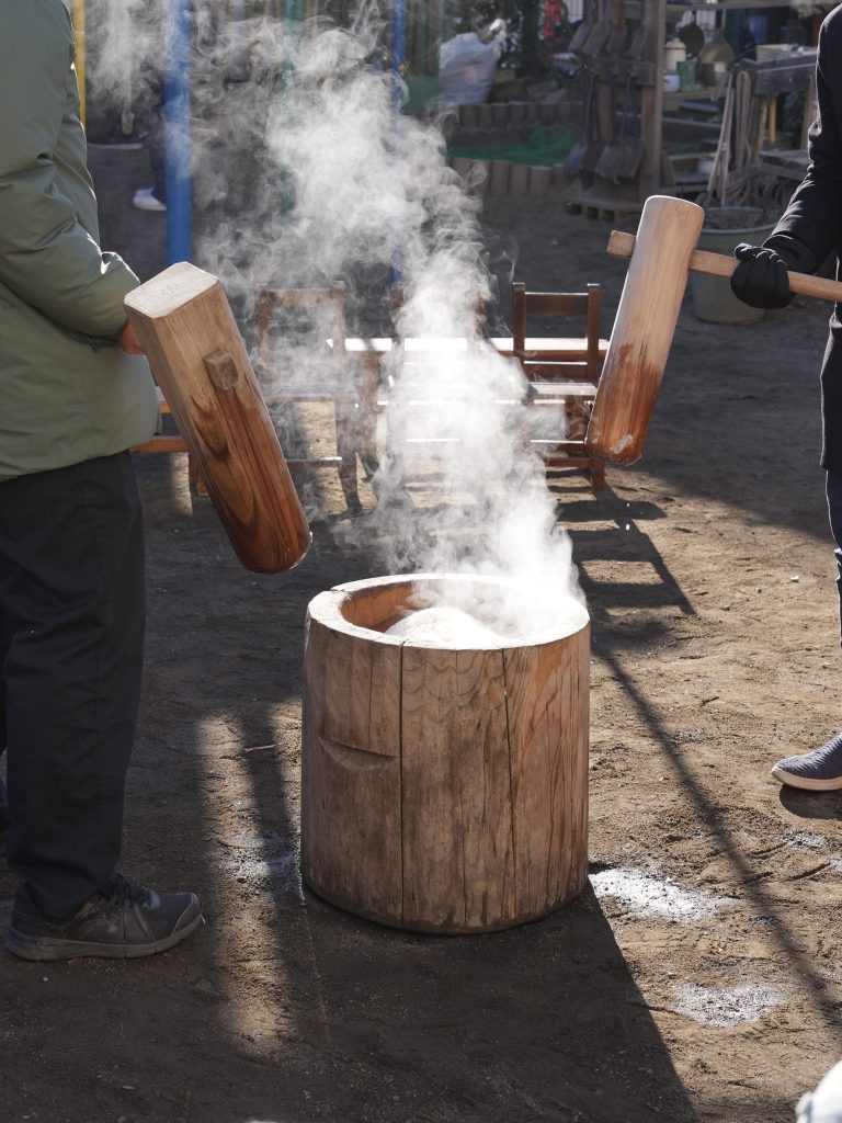 そして、そろそろかなー?と、炊き立てほかほかの餅米が、立派な臼の中にうつされました。湯気がもくもくっと広がります。水をつけた手で軽く混ぜ、いよいよ餅つきです。